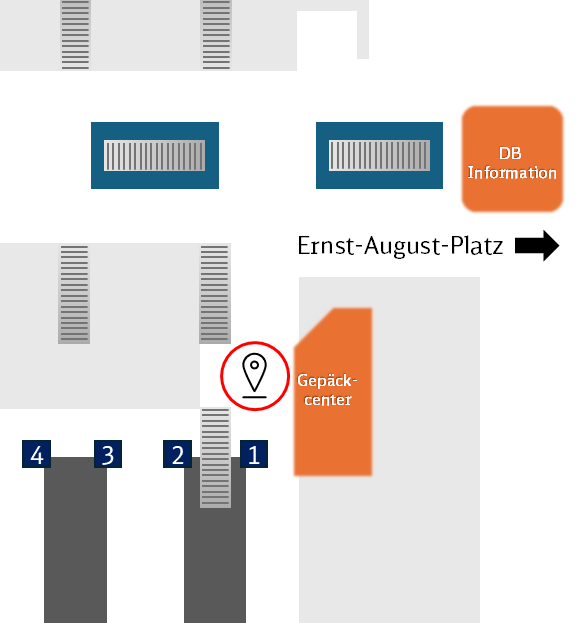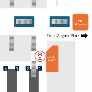 Aus der Bahnhofshalle kommend, befindet sich der Treffpunkt am neuen Treppenaufgang an Bahnsteig 1/2 beim Gepäckcenter. Einen Lageplan finden Sie am Ende der Seite.