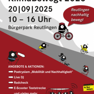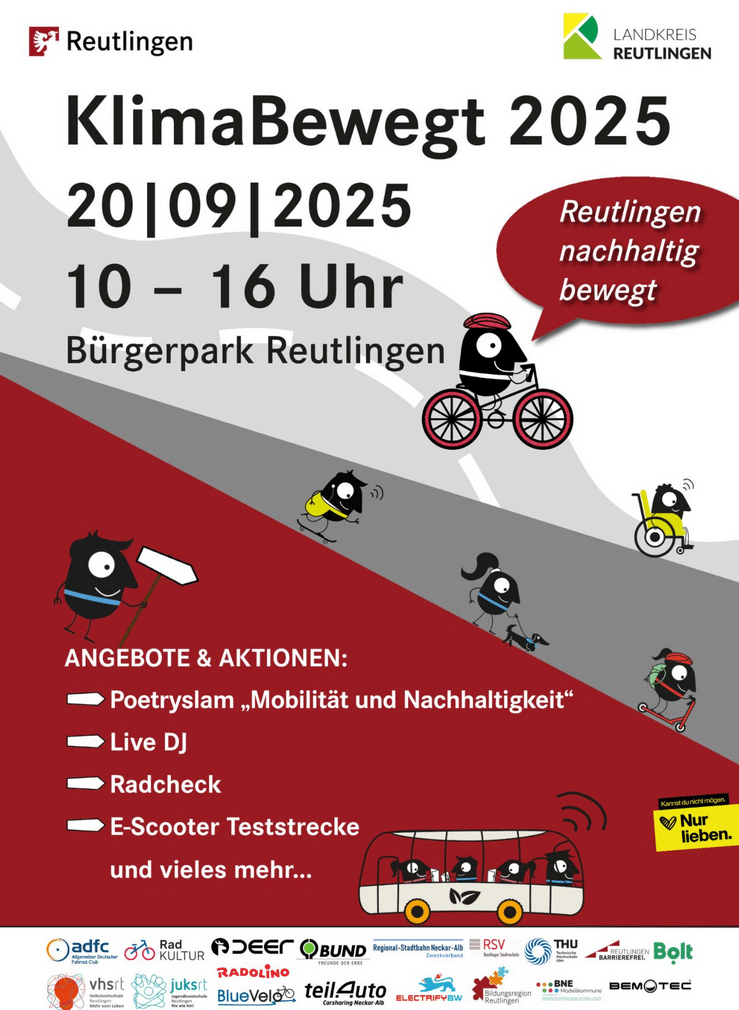Im Rahmen der Europäischen Mobilitätswoche und des Tags der Schiene findet am 20.09.2025 von 10 bis 16 Uhr der KlimaBewegt Tag im Reutlinger Bürgerpark statt. Rund um die Themen Klima und nachhaltiger Mobilität gibt es ein spannendes und umfangreiches Angebot an Mitmachaktionen und Informationen.