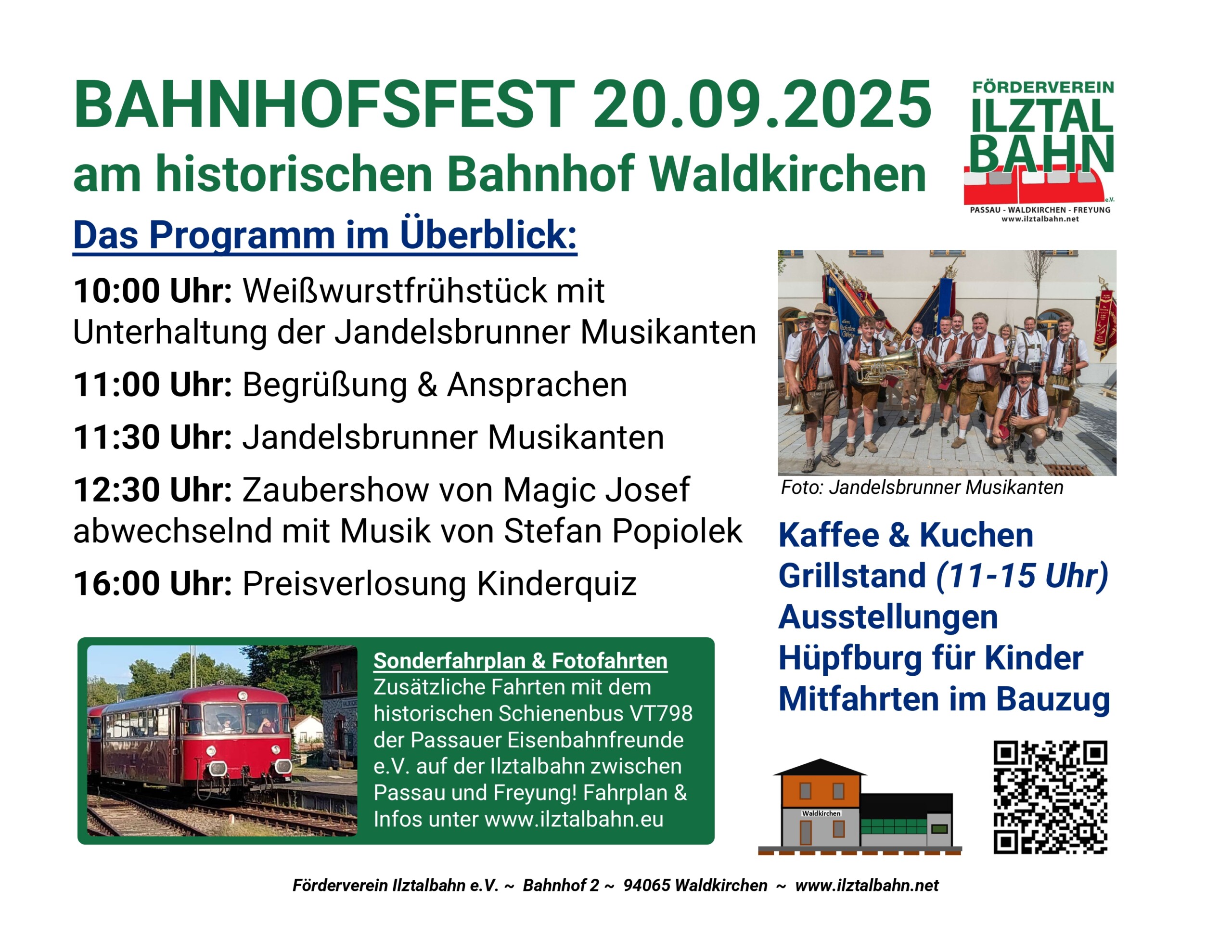 Am 20. September 2025 ist es wieder so weit! Anlässlich zum bundesweiten Tag der Schiene veranstaltet der Förderverein Ilztalbahn e.V. wieder ein Bahnhofsfest in Waldkirchen! Rund um das historische Bahnhofsgebäude gibt es zahlreiche Attraktionen sowie ein buntes Programm für die ganze Familie.