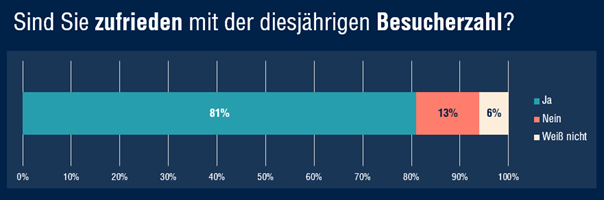 Besonders erfreulich fällt das Urteil zur Besucherresonanz aus. 81 Prozent der Befragten zeigten sich mit der Zahl der Besucherinnen und Besucher ihrer Veranstaltung zufrieden, lediglich 13 Prozent äußerten sich unzufrieden. 6 Prozent konnten keine eindeutige Einschätzung abgeben („Weiß nicht“).